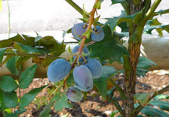 | 4月に愛らしい黄色の花を咲かせた「ヒイラギナンテン」が実を付けました。名前は「ナンテン」とついていますが、実は赤くなくご覧のとおりブドウ色です。花についてはバックナンバー「2009年4月7日撮影」をご覧ください。 | |||