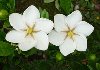 | 実が熟しても口が開かないところから 「口無し」の名になった説と、実にある突起部分をくちばしに 見立てた「クチハシ」から変化したとも言われています。一重ものは早咲きで八重ものはやや遅咲です。写真は一重。 | |||