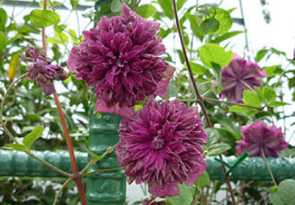 | クレマチスも満開です。美しいムラサキの花びらをめいっぱい広げています。小さく開いていた時とはだいぶ雰囲気が違いますね。バックナンバー「2009年5月25日撮影」を、ご覧ください。 | |||