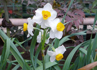 ヒガンバナ科スイセン属で、古くから園芸化されてきた球根植物です。ラッパスイセンやニホンズイセンなど色や形の異なる種や品種が多く、総称してスイセンと呼んでいます。多年草で、冬から春にかけて白や黄の花を咲かせます。 |
