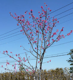 | 漢字では「寒緋桜」。別名 「緋寒桜」(ひかんざくら)。これとは別に「彼岸桜」(ひがんざくら)という花があり、間違えやすいので、混同を避けるために、“緋寒”を“寒緋”と逆にして「寒緋桜」との呼び方に変えたといわれています。鮮やかな濃いピンク色の花なのでとても目立ちます。 | ||||